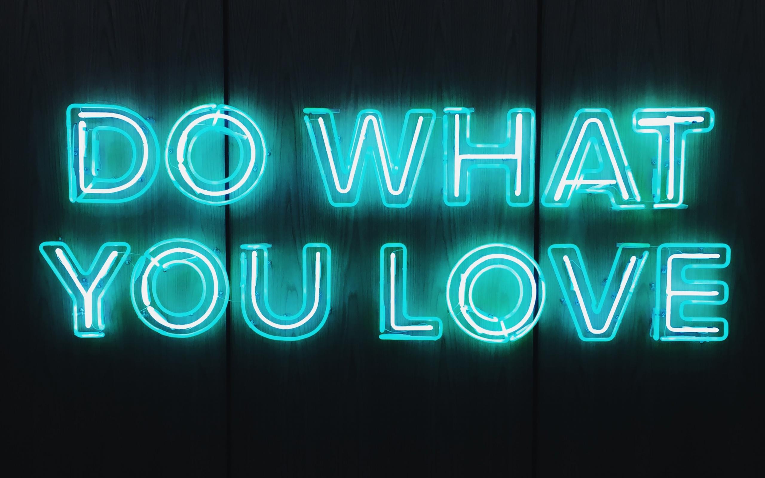 Wallpaper Neon inscription Do What You Love on wooden background.