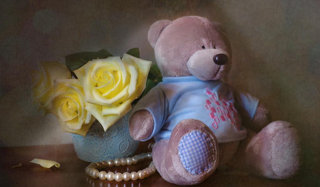 Wallpaper Big teddy bear with a bouquet of yellow roses