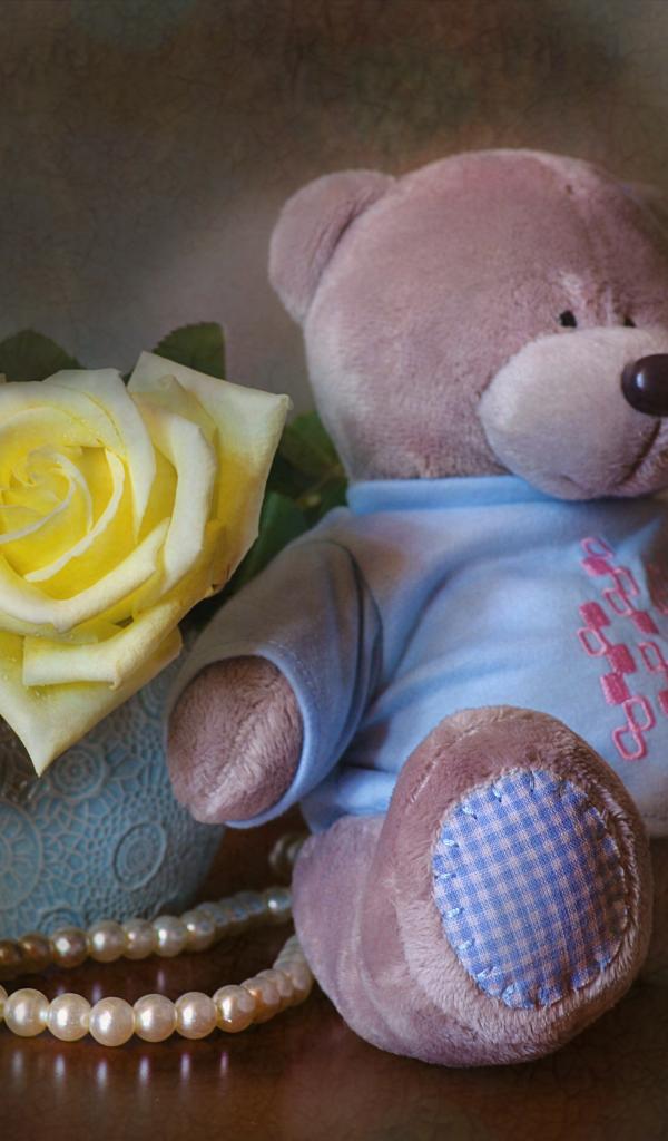 Wallpaper Big teddy bear with a bouquet of yellow roses
