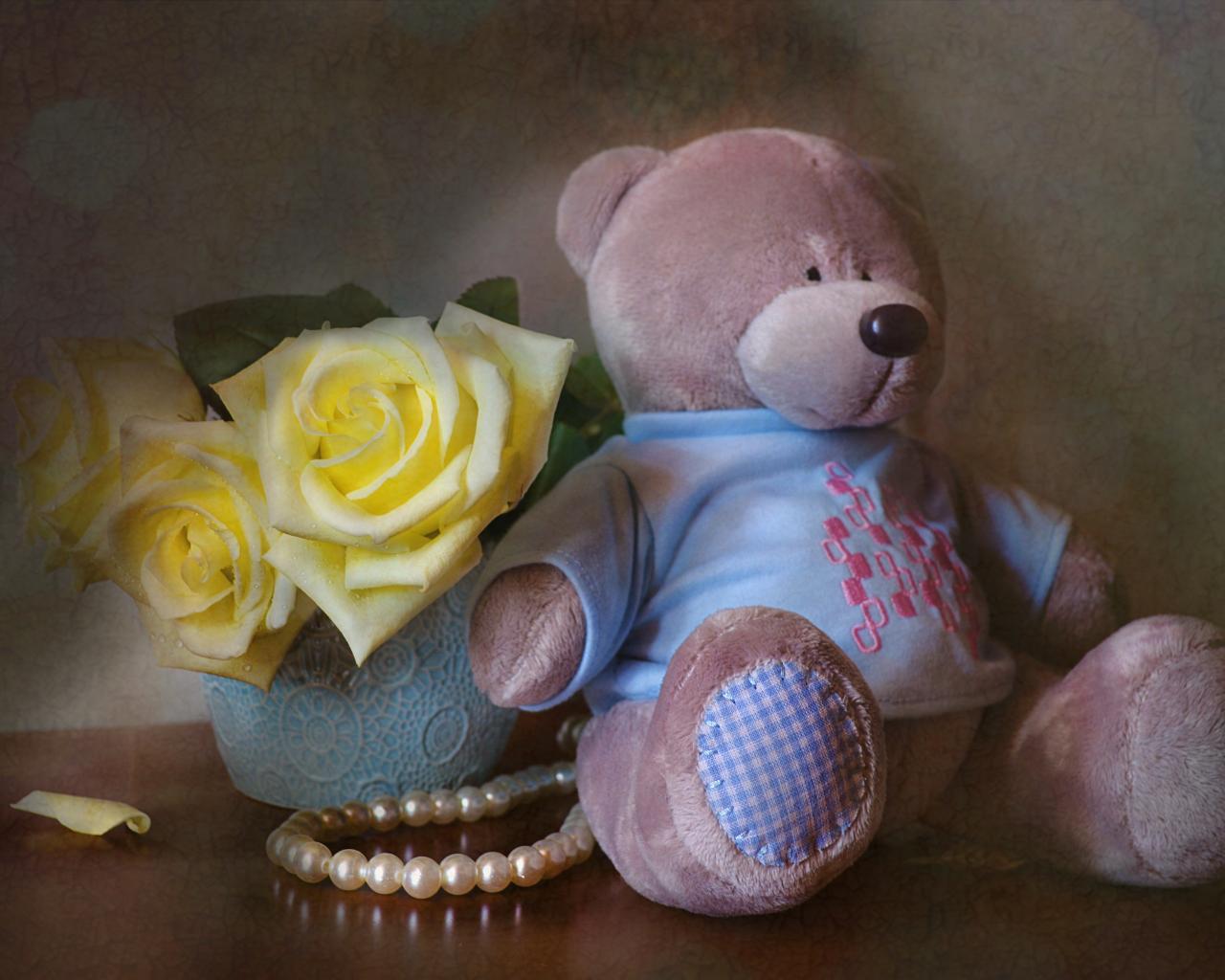 Wallpaper Big teddy bear with a bouquet of yellow roses