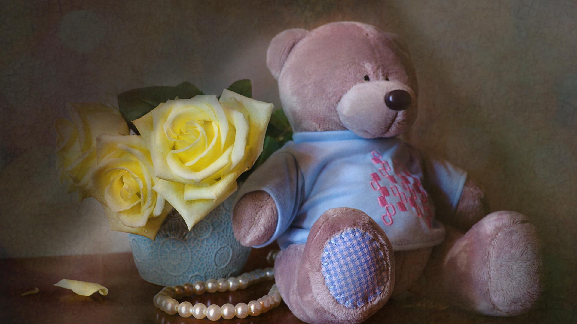 Wallpaper Big teddy bear with a bouquet of yellow roses