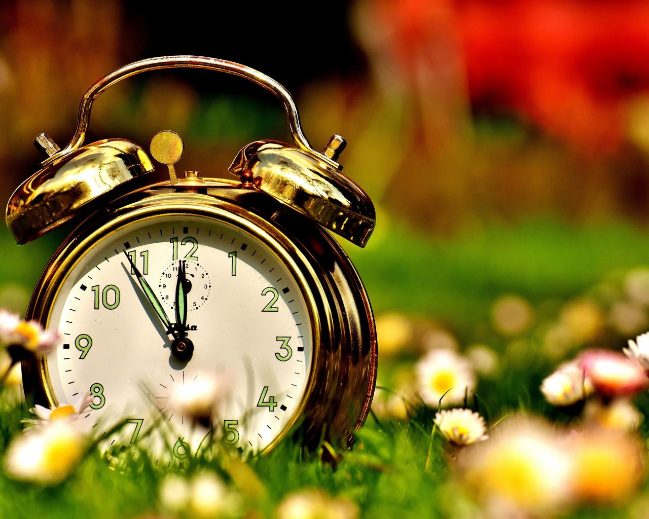Wallpaper Golden alarm clock stands on the grass with daisies