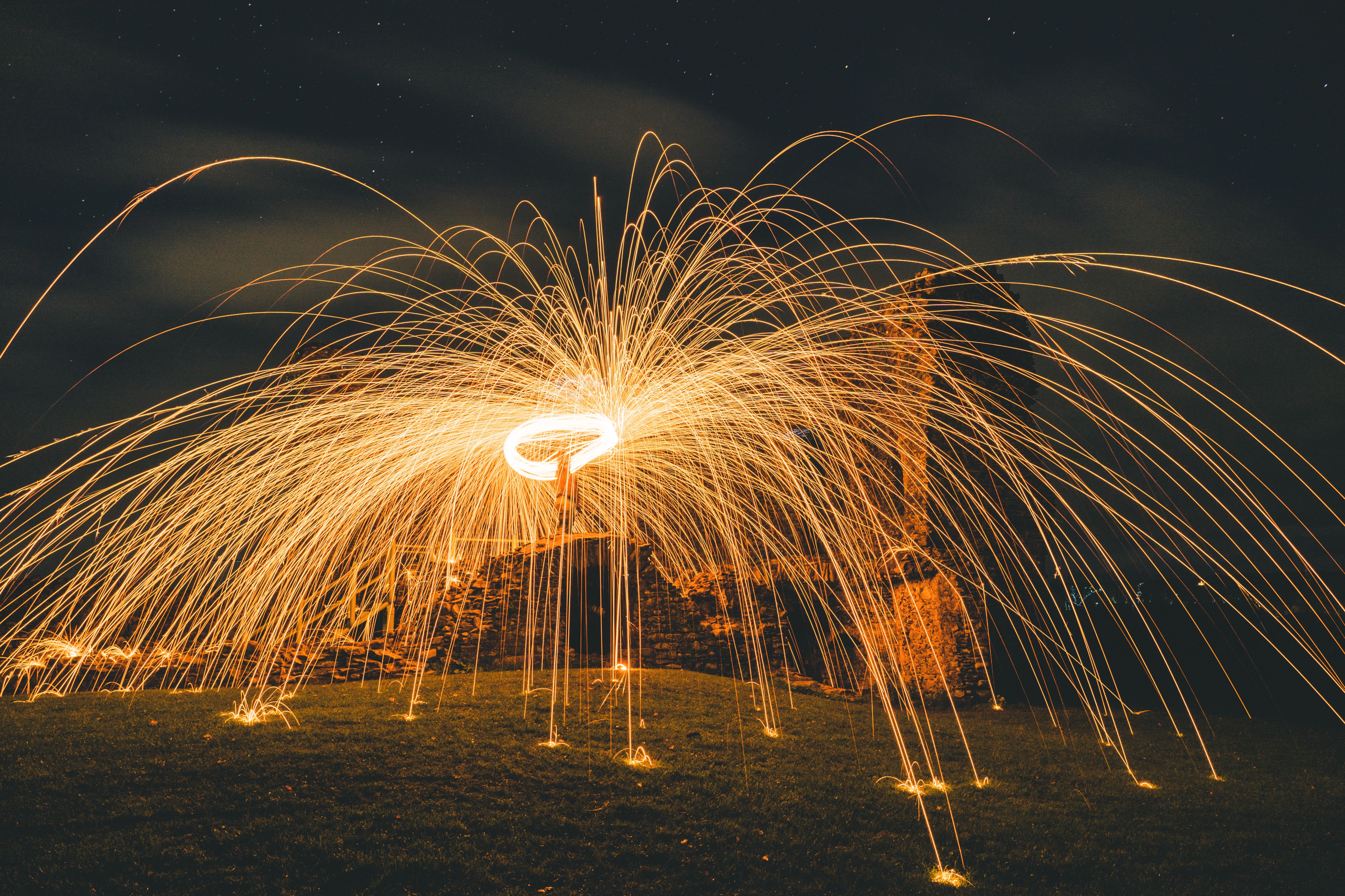 Wallpaper Bright fiery sparks of fireworks on the ruins