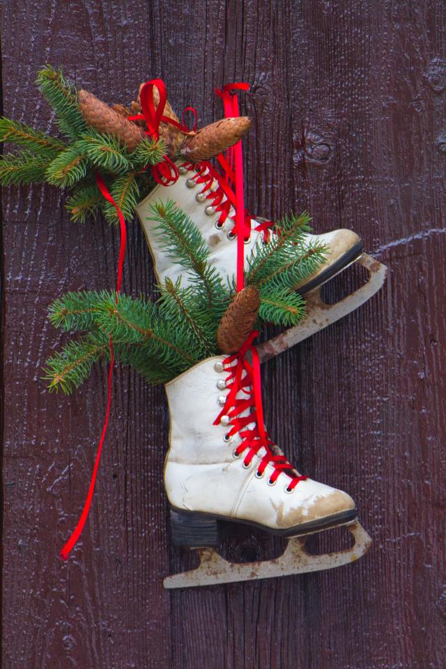 Wallpaper Old skates with fir branches on the door