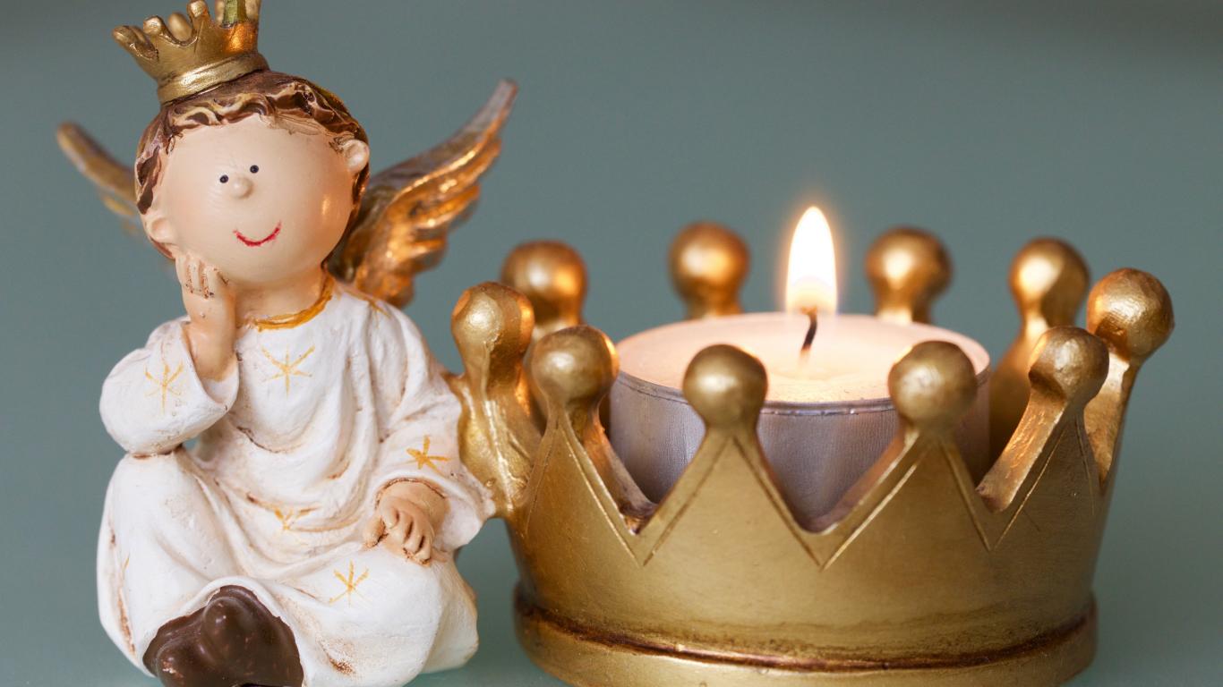 Wallpaper The figurine of an angel is lit by burning candles on a black background