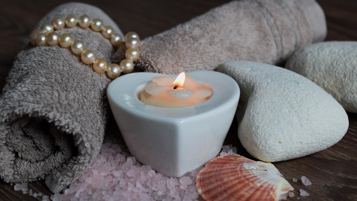 Wallpaper Beautiful candle with towel, beads, stones and sea salt
