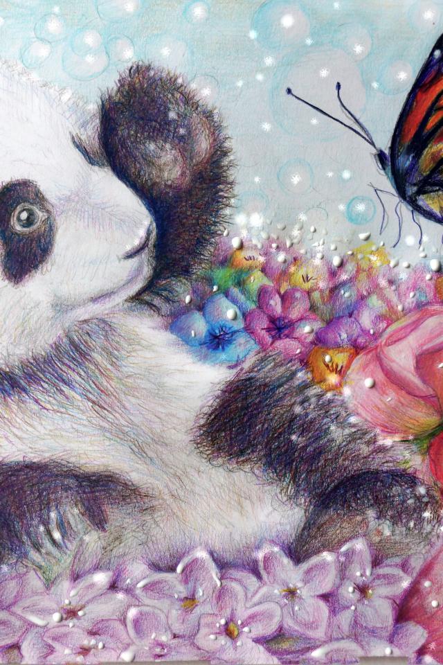 Wallpaper A painted panda bear with a butterfly and a red rose