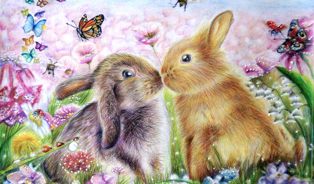 Wallpaper Two painted rabbits with butterflies