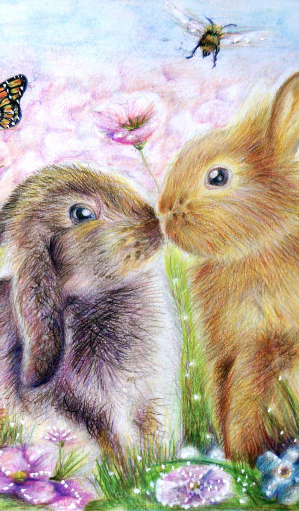 Wallpaper Two painted rabbits with butterflies