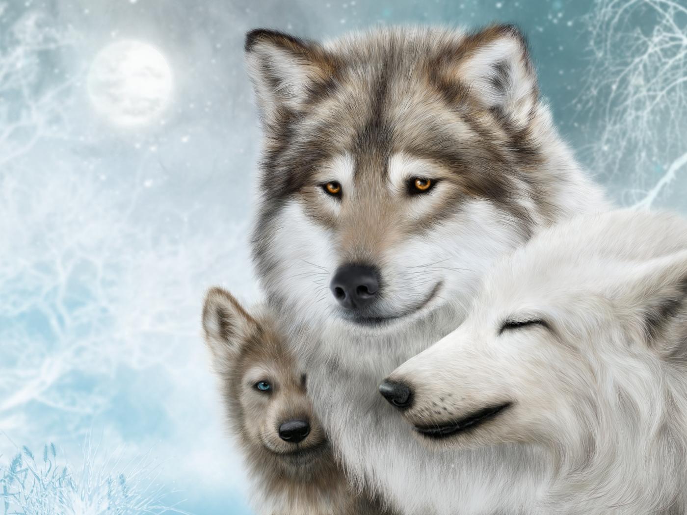 Wallpaper Family of three wolves in winter, drawing