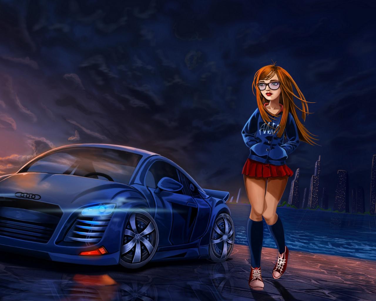 Wallpaper Painted girl in a short skirt at the car Audi