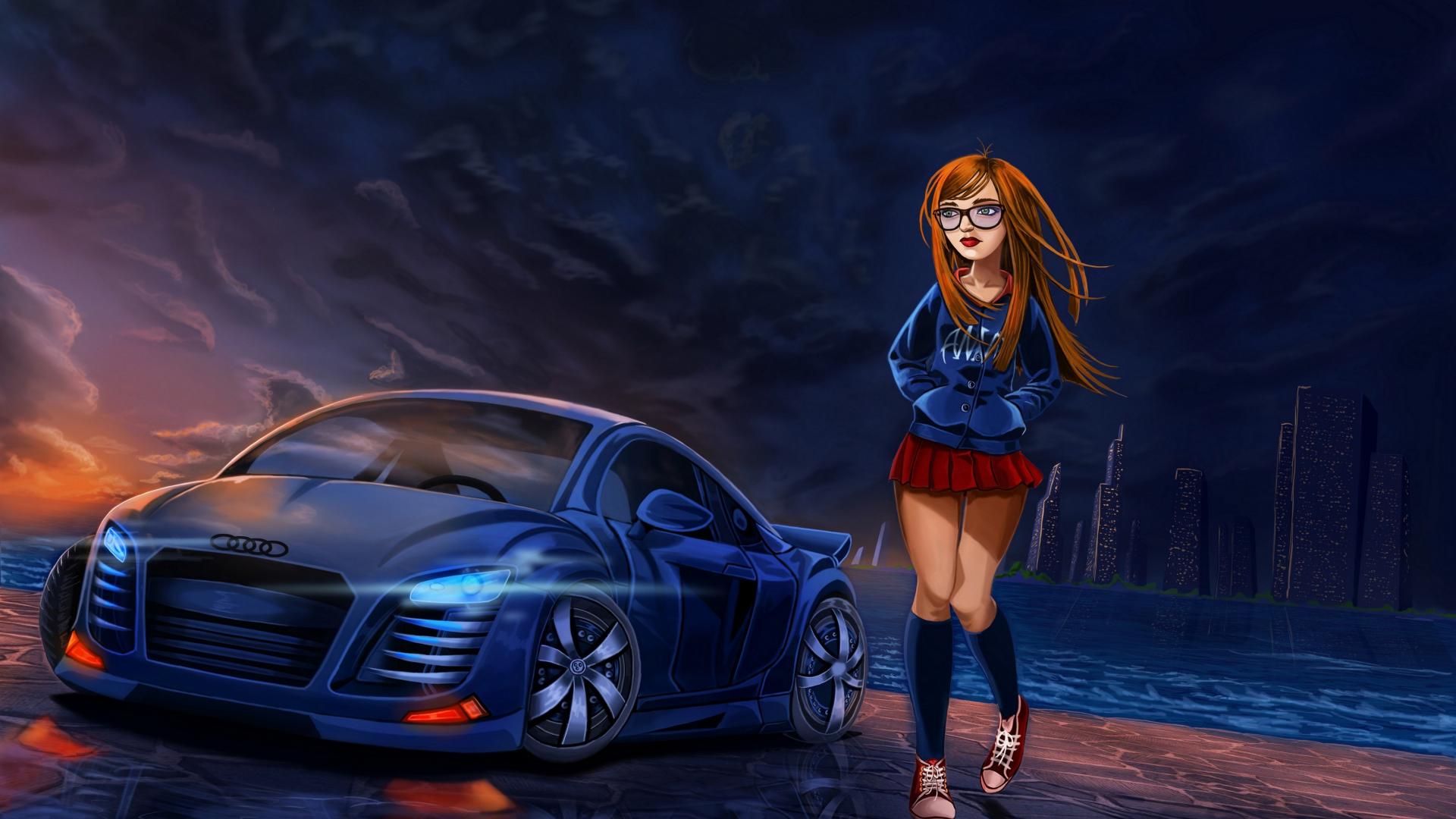 Wallpaper Painted girl in a short skirt at the car Audi