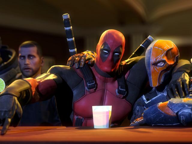 Wallpaper Deadpool in a bar with friends