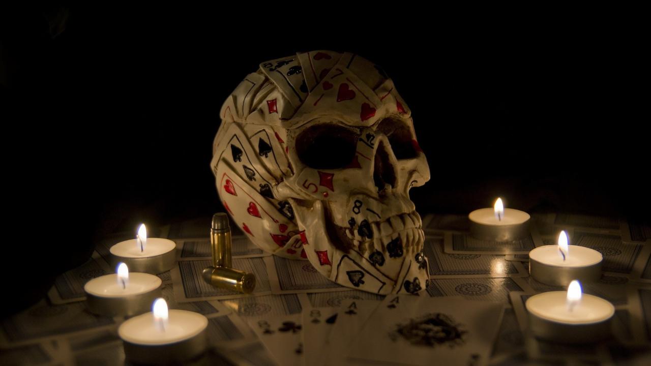 Wallpaper The skull of playing cards including candles