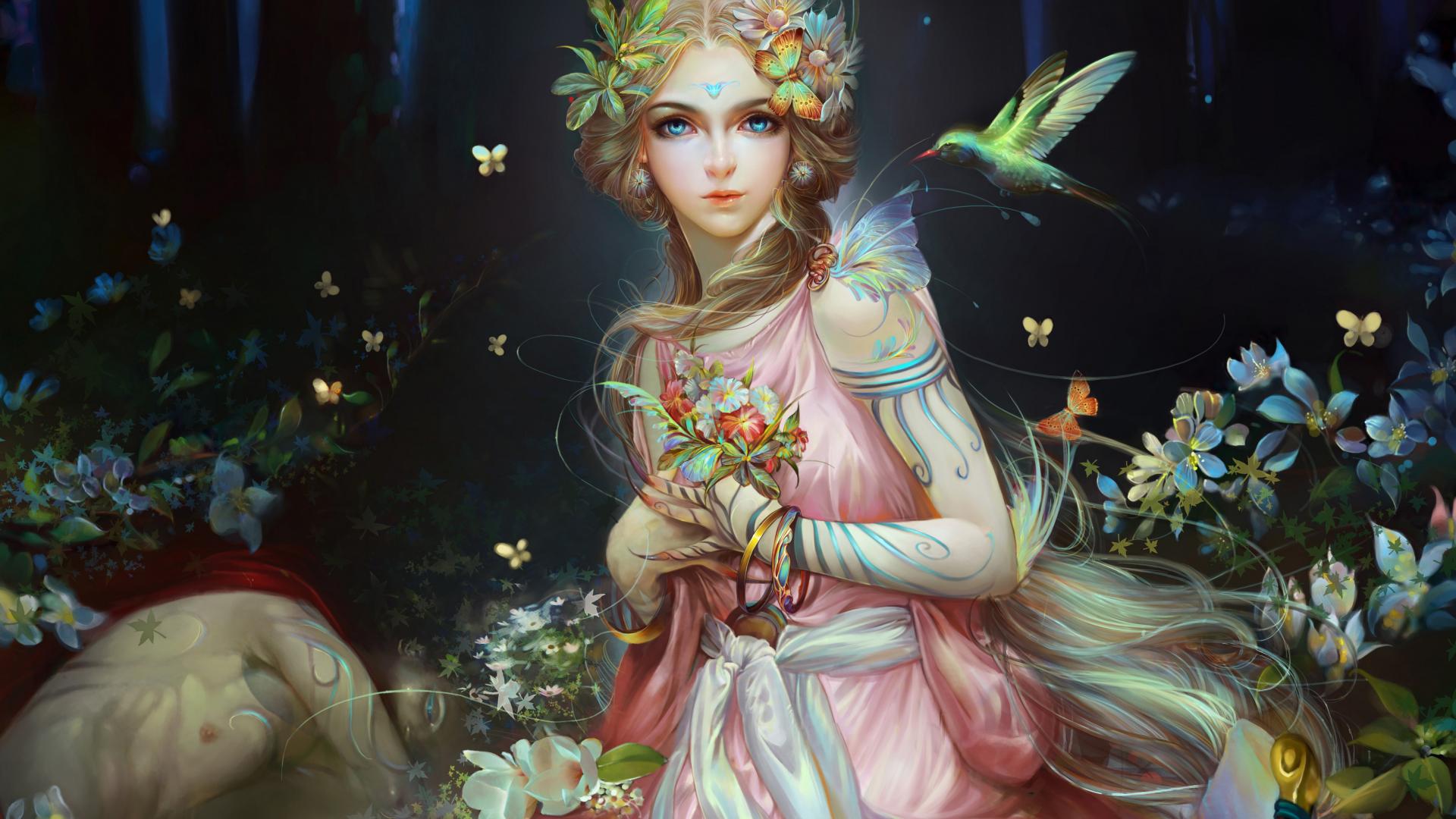 Wallpaper Beautiful fantastic girl with unusual flowers