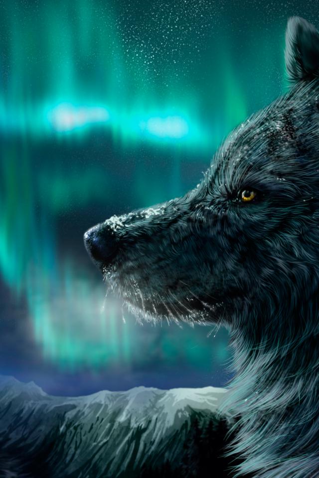 Wallpaper Beautiful black wolf in the background of aurora borealis, fantasy