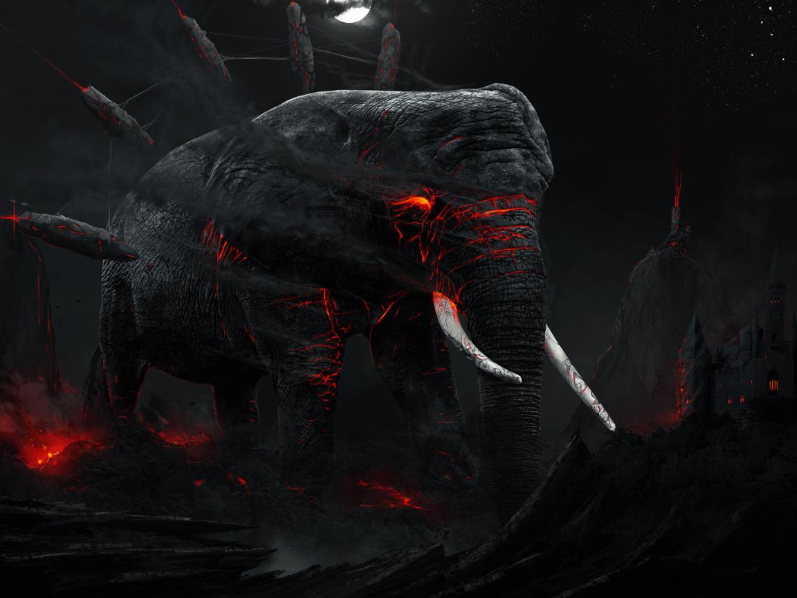 Wallpaper Big black elephant with magma inside in a ruined city