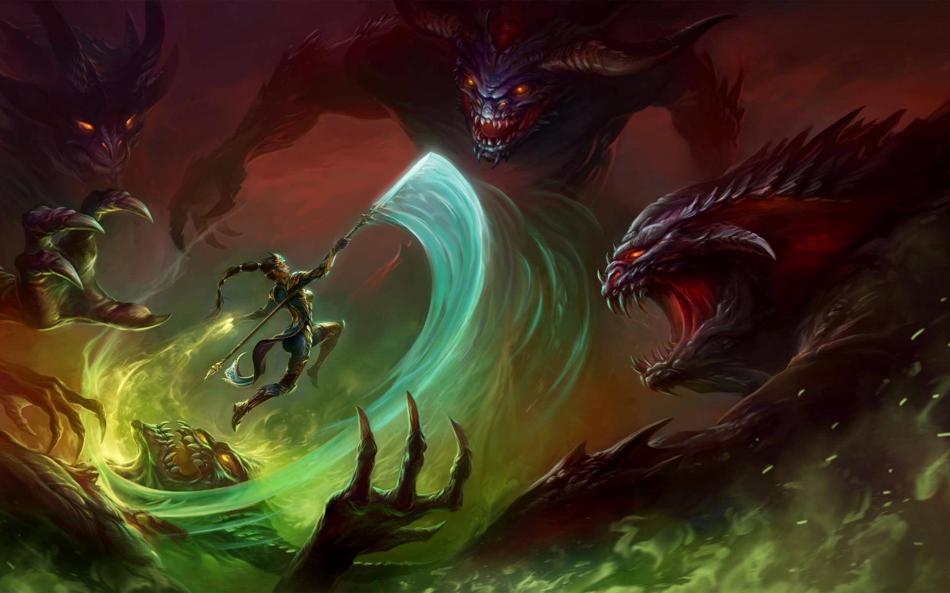 Wallpaper Woman warrior fighting with dragons fantasy