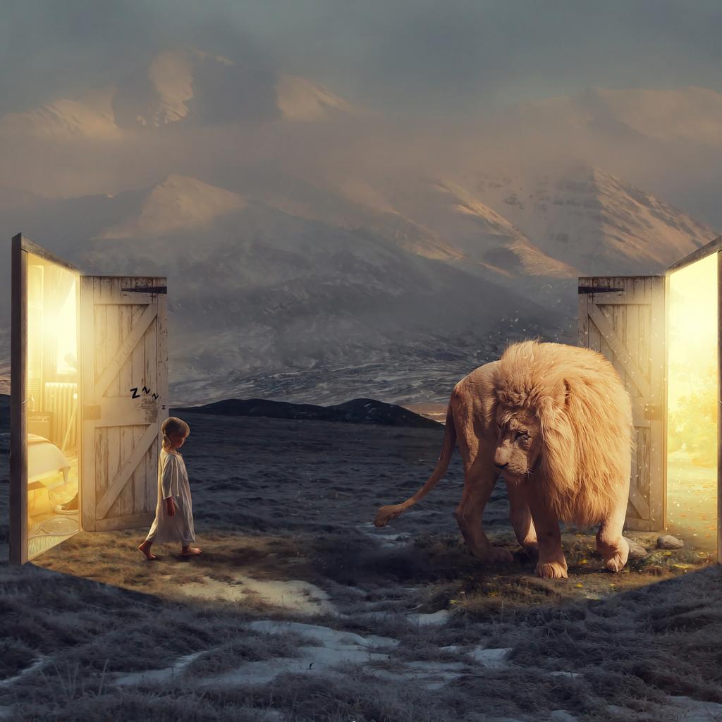 Wallpaper A little girl goes to a fantastic door at the white lion