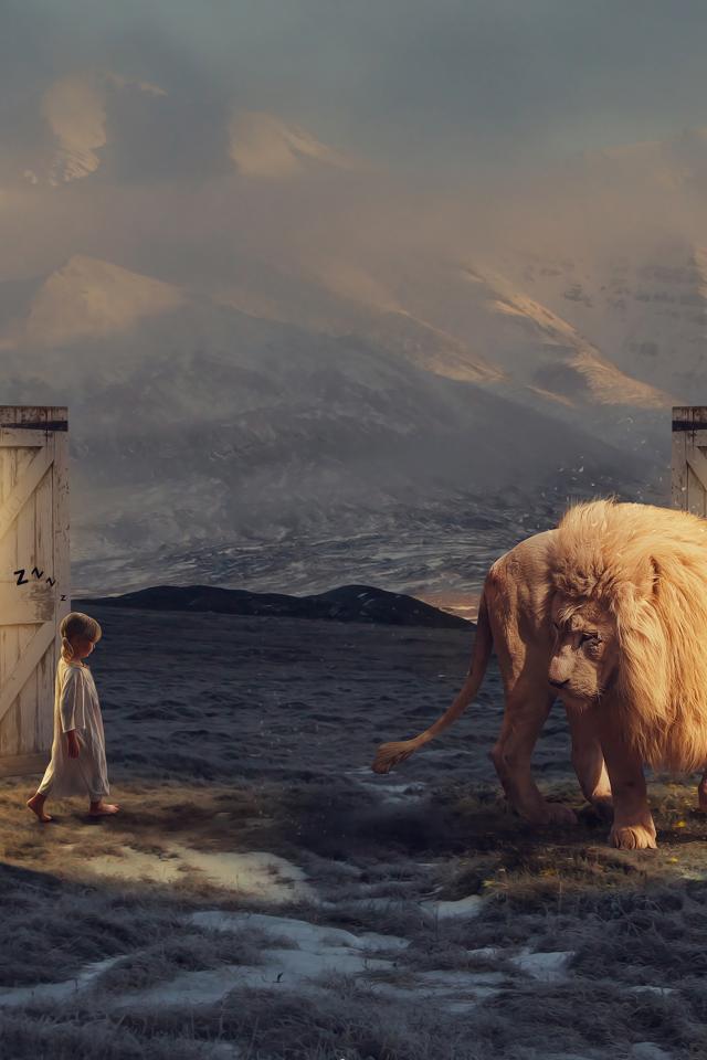 Wallpaper A little girl goes to a fantastic door at the white lion