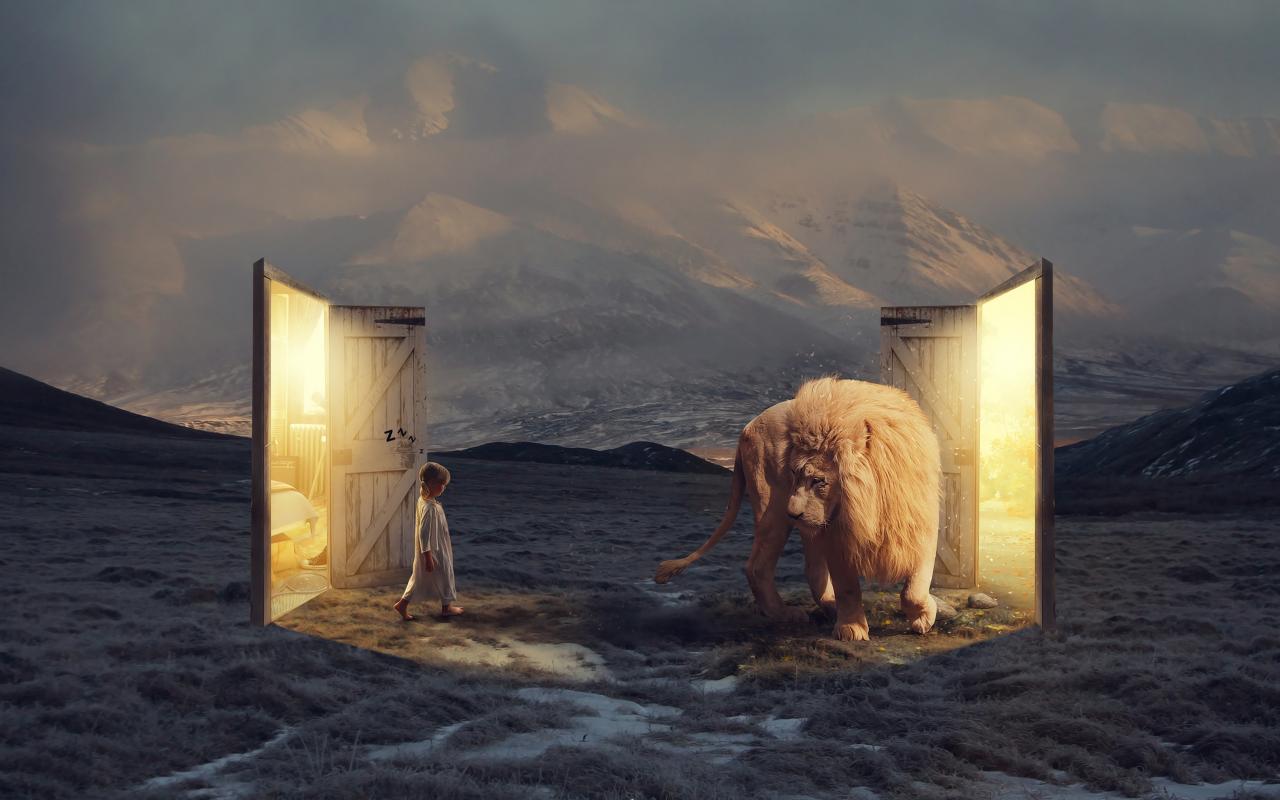 Wallpaper A little girl goes to a fantastic door at the white lion