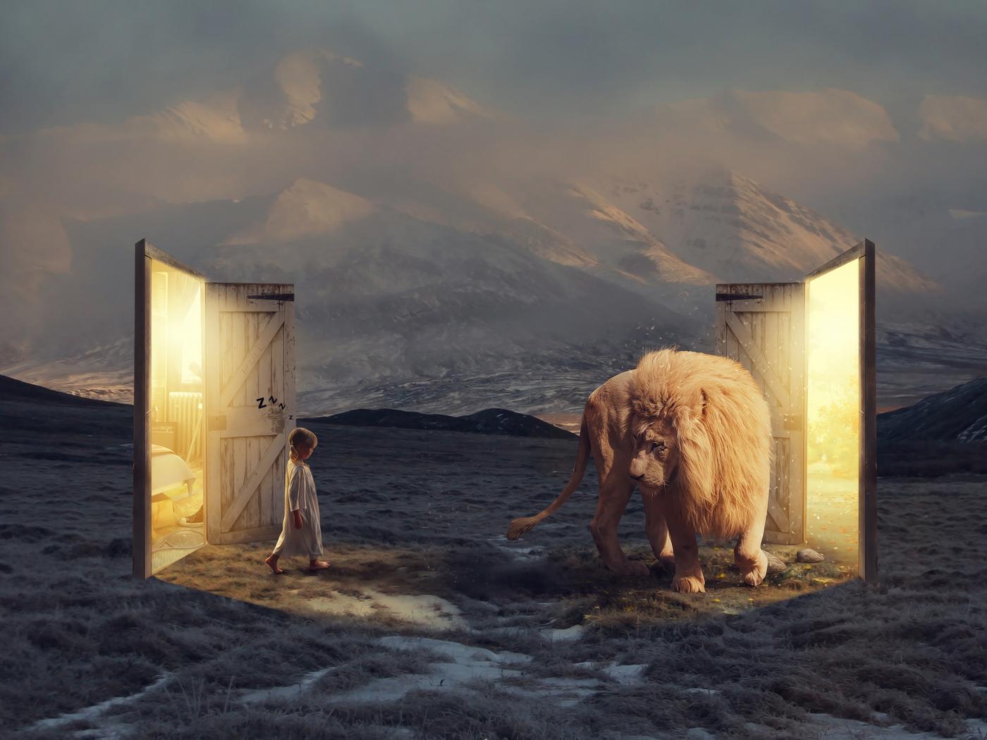 Wallpaper A little girl goes to a fantastic door at the white lion