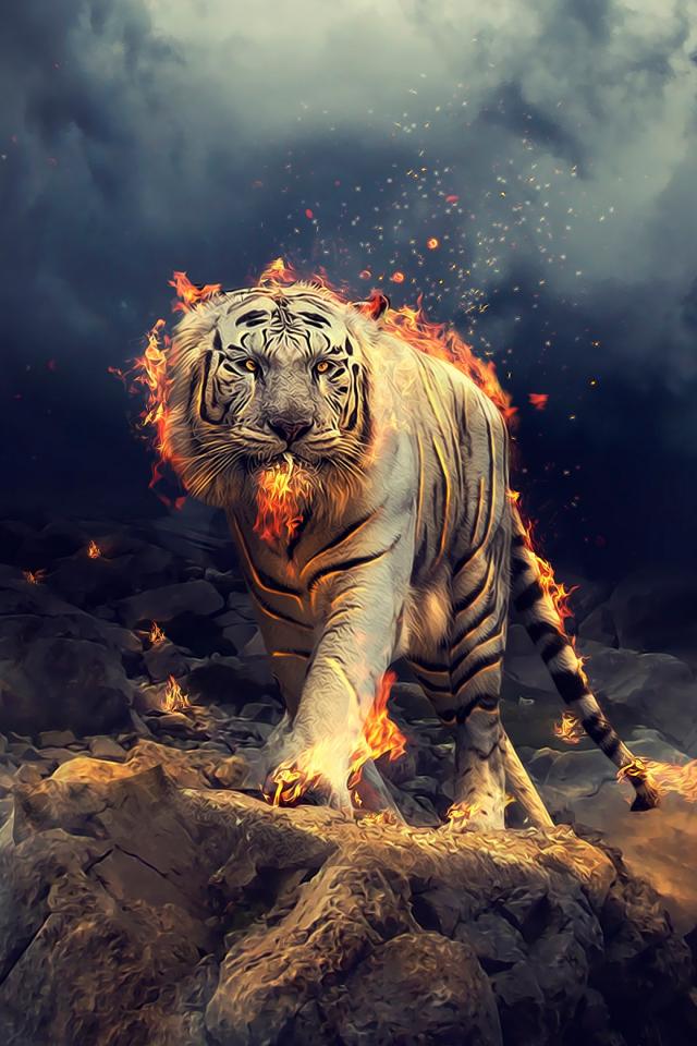Wallpaper The fire tiger walks the rocks