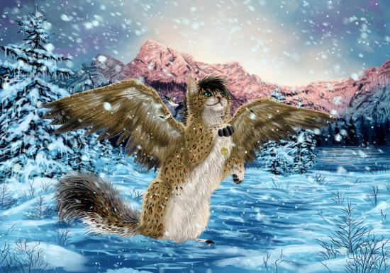 Wallpaper Magic cat with wings in the winter forest, fantasy