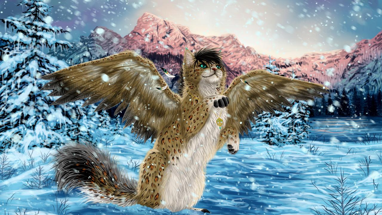 Wallpaper Magic cat with wings in the winter forest, fantasy