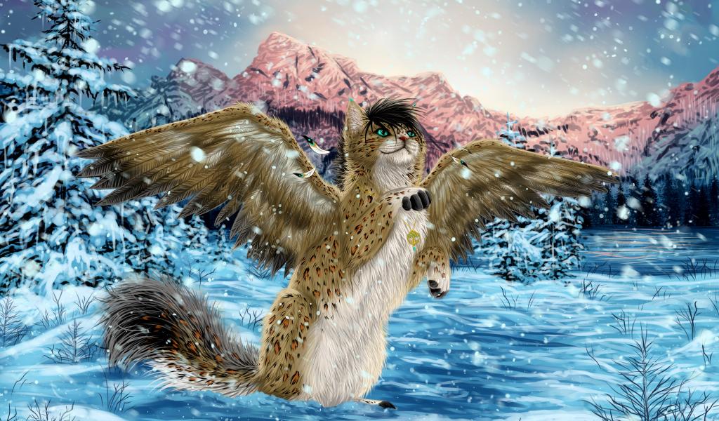 Wallpaper Magic cat with wings in the winter forest, fantasy
