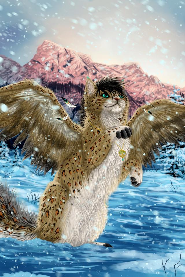 Wallpaper Magic cat with wings in the winter forest, fantasy
