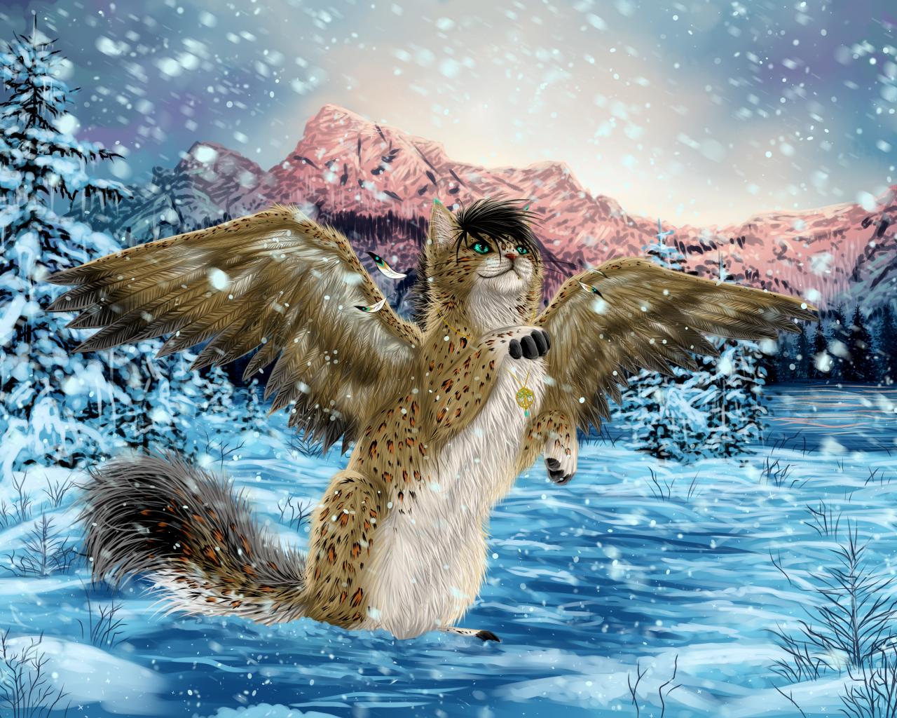 Wallpaper Magic cat with wings in the winter forest, fantasy