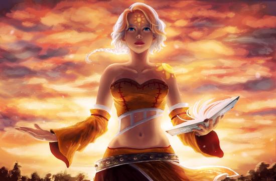 Wallpaper Blue-eyed girl blonde with a magic book in her hand, fantasy