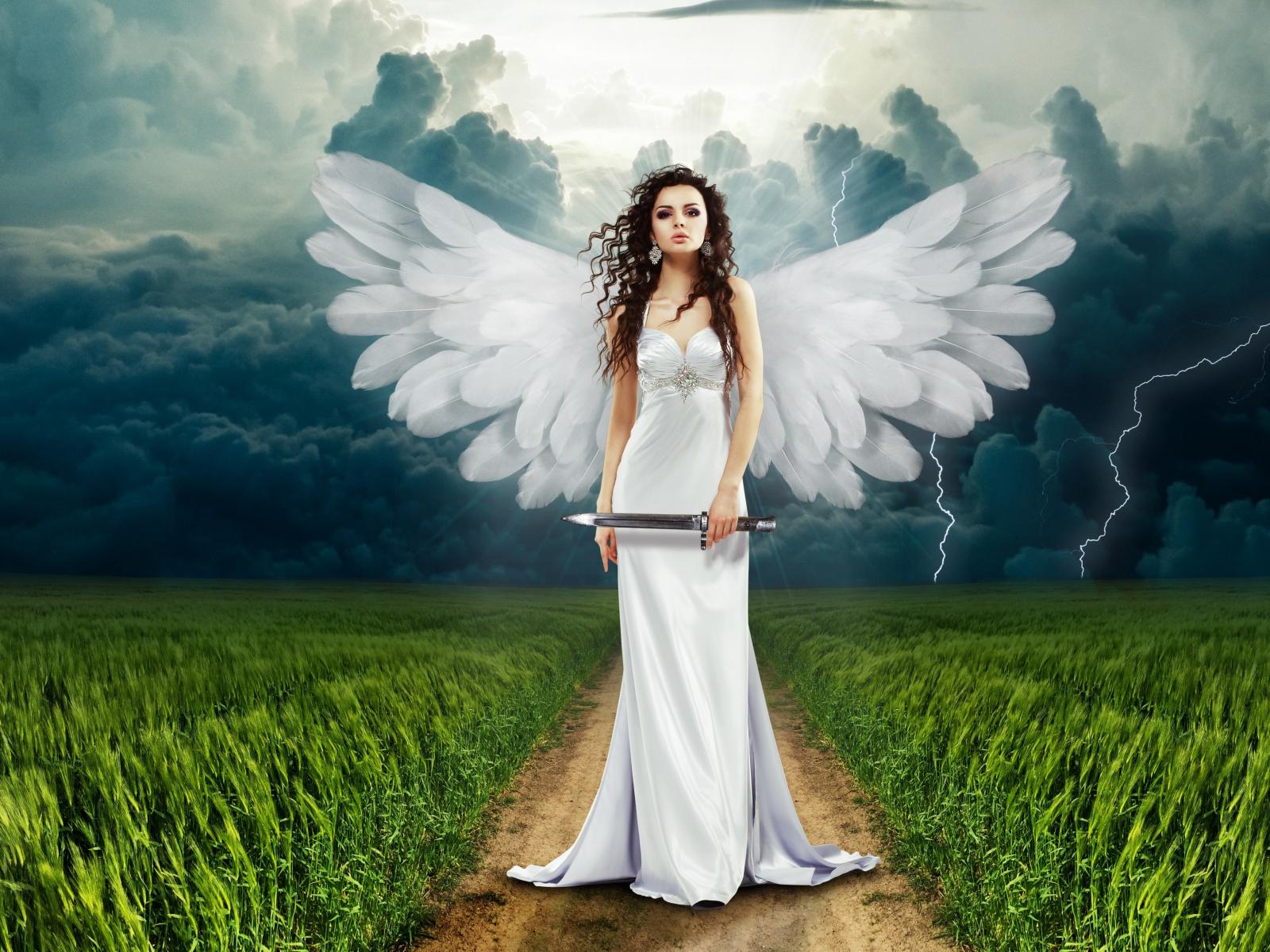 Wallpaper An angel girl in a beautiful white dress with a sword in her hands