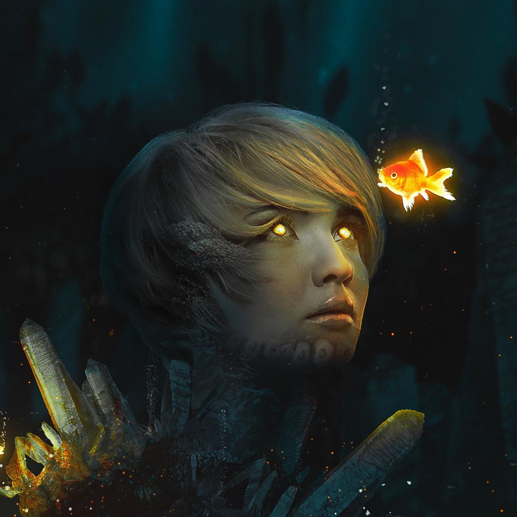 Wallpaper Girl with glowing eyes at the bottom with goldfish