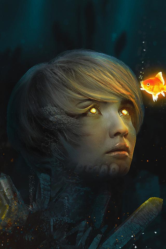 Wallpaper Girl with glowing eyes at the bottom with goldfish