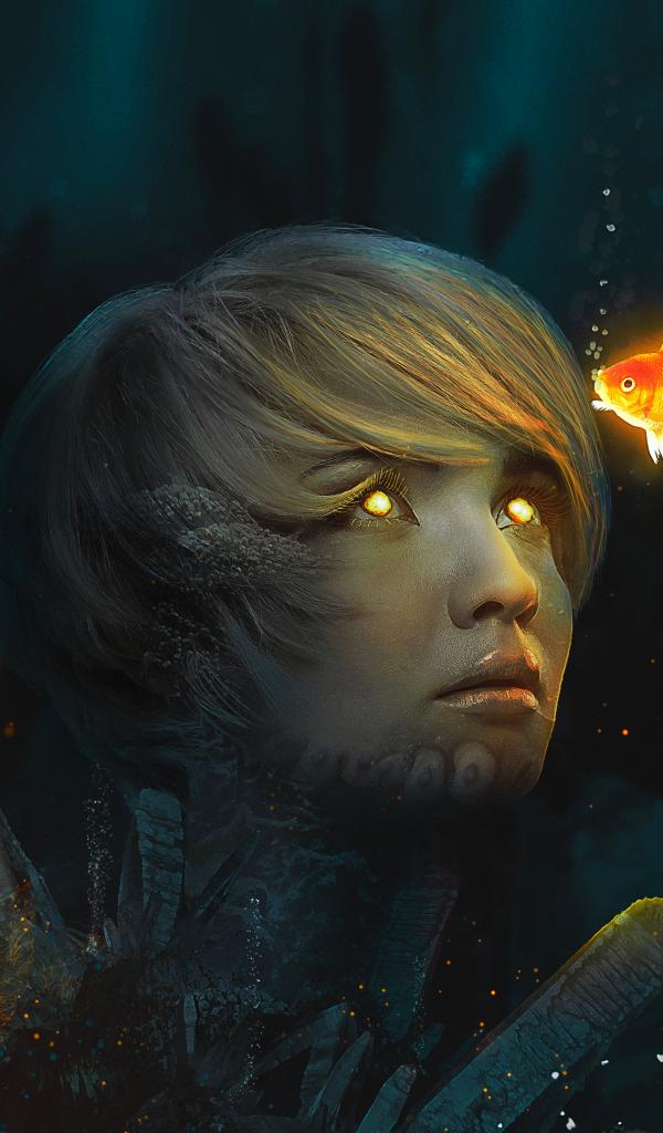 Wallpaper Girl with glowing eyes at the bottom with goldfish