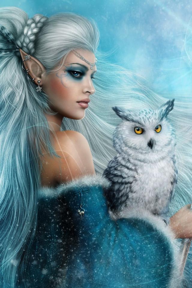 Wallpaper A woman elf with a white owl and a scepter in her hands, a fantasy