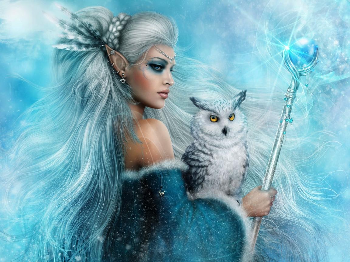 Wallpaper A woman elf with a white owl and a scepter in her hands, a fantasy