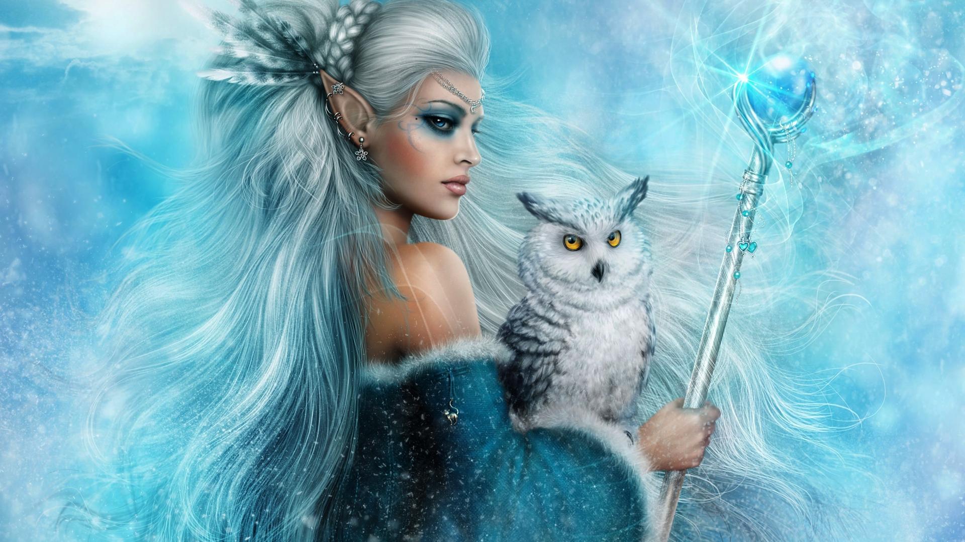 Wallpaper A woman elf with a white owl and a scepter in her hands, a fantasy