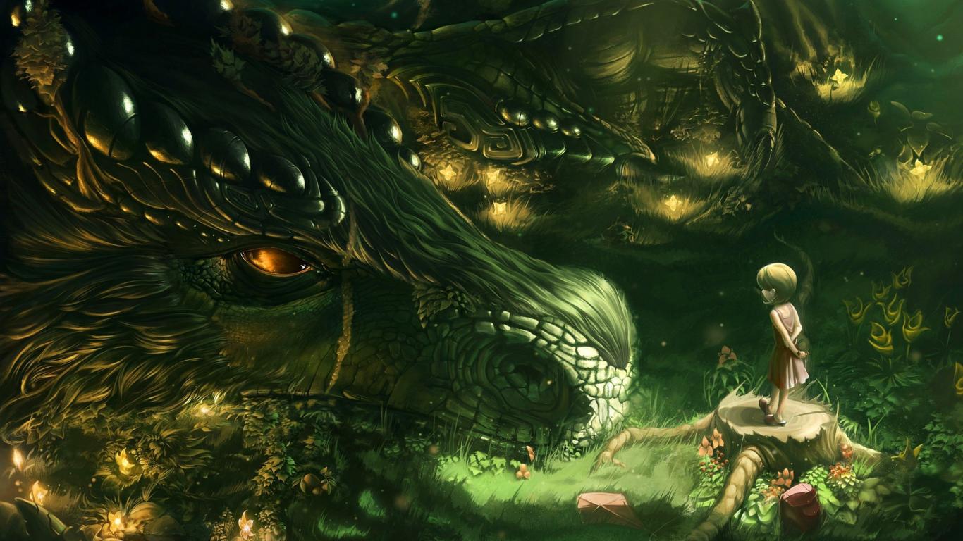 Wallpaper Big dragon and little girl, fantasy