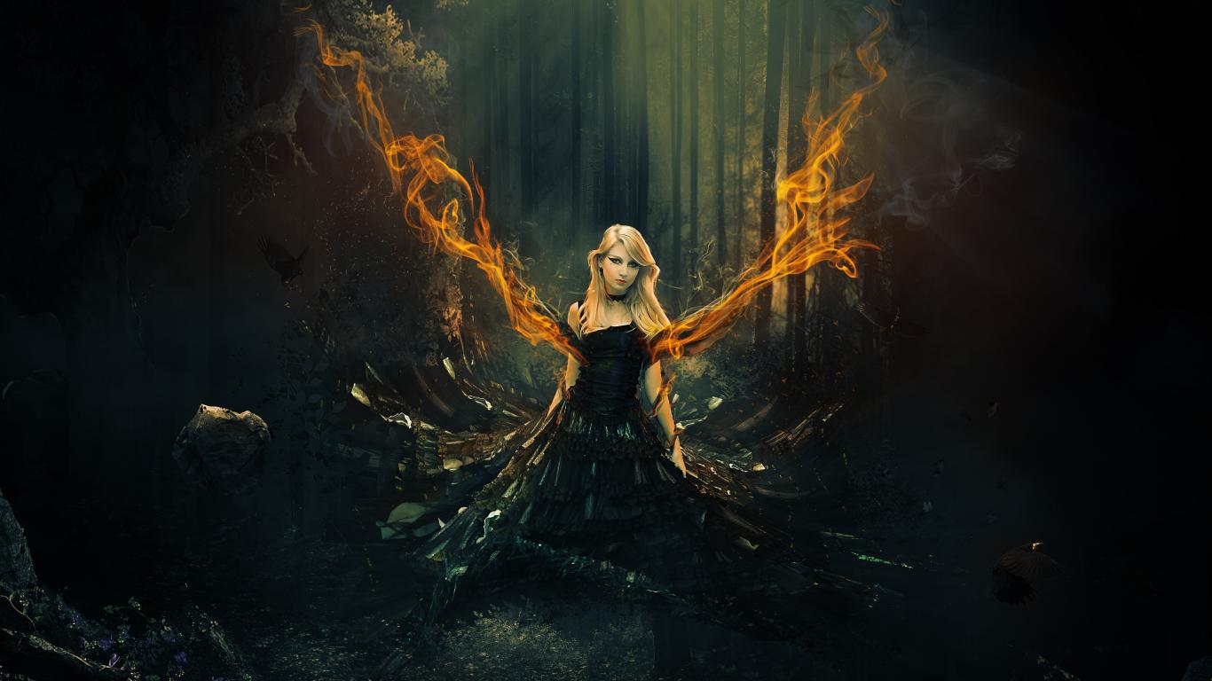 Wallpaper Fantastic girl in a black dress with fiery wings
