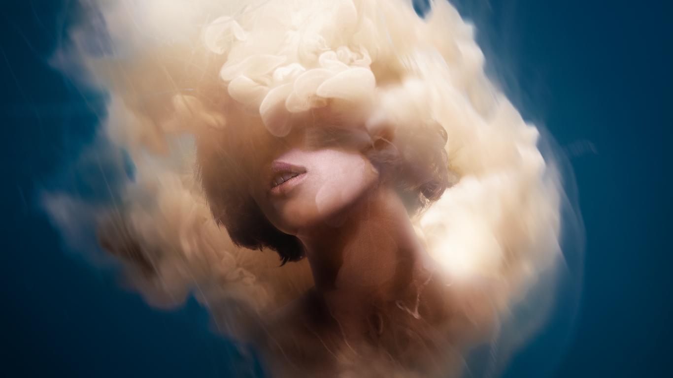 Wallpaper The girl`s face in the smoke on a blue background, illusion