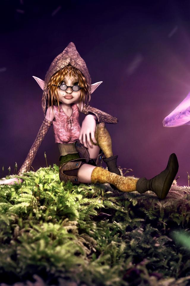 Wallpaper Fantastic elf sitting on mossy ground with neon mushrooms