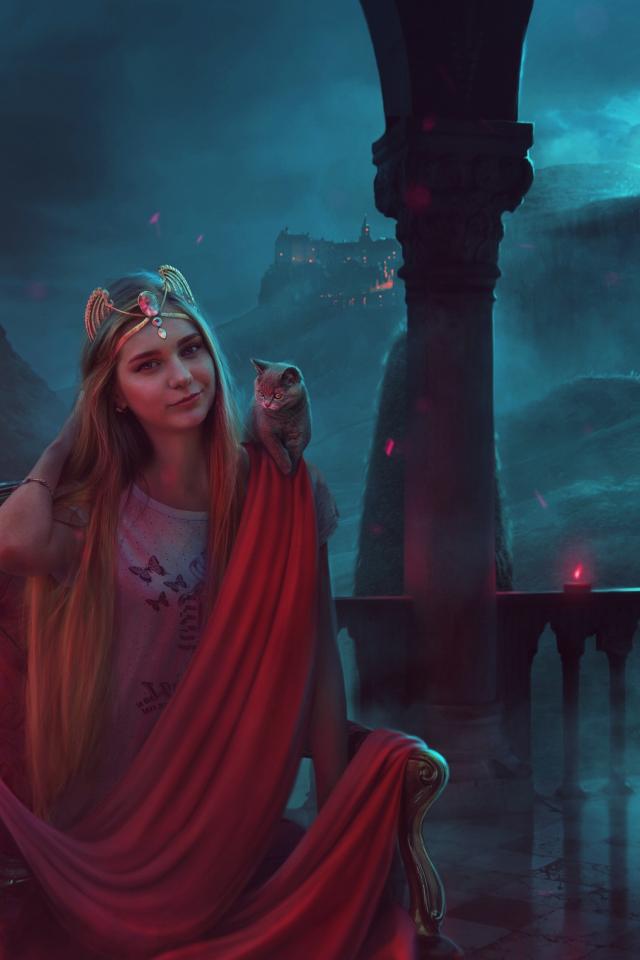 Wallpaper Fantastic girl with a gray kitten on her shoulder