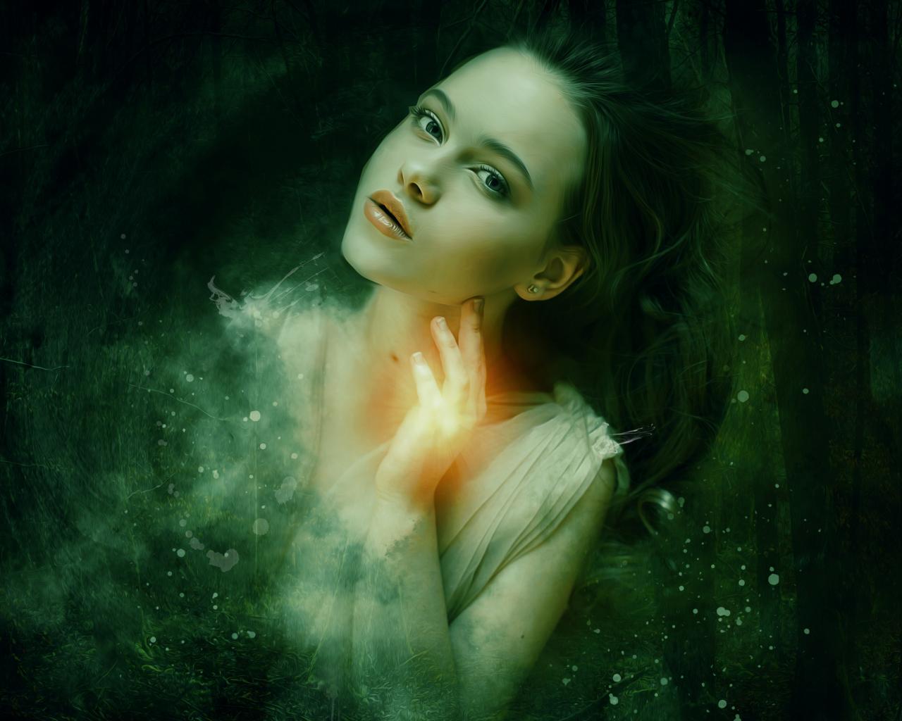 Wallpaper Fantastic girl on a background of dark forest