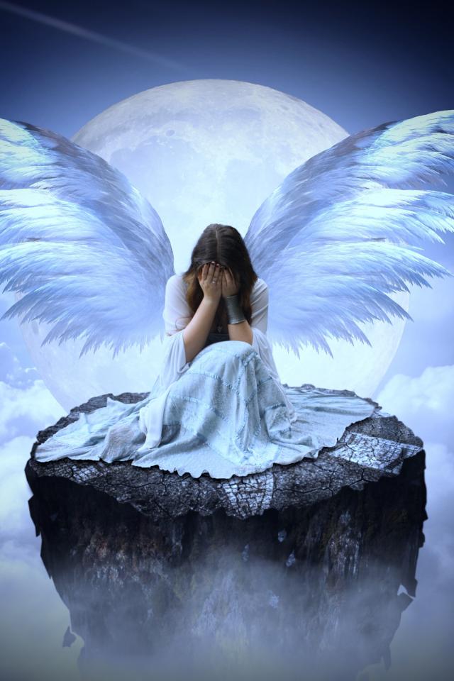 Wallpaper Girl with angel wings sits on a stone in the clouds
