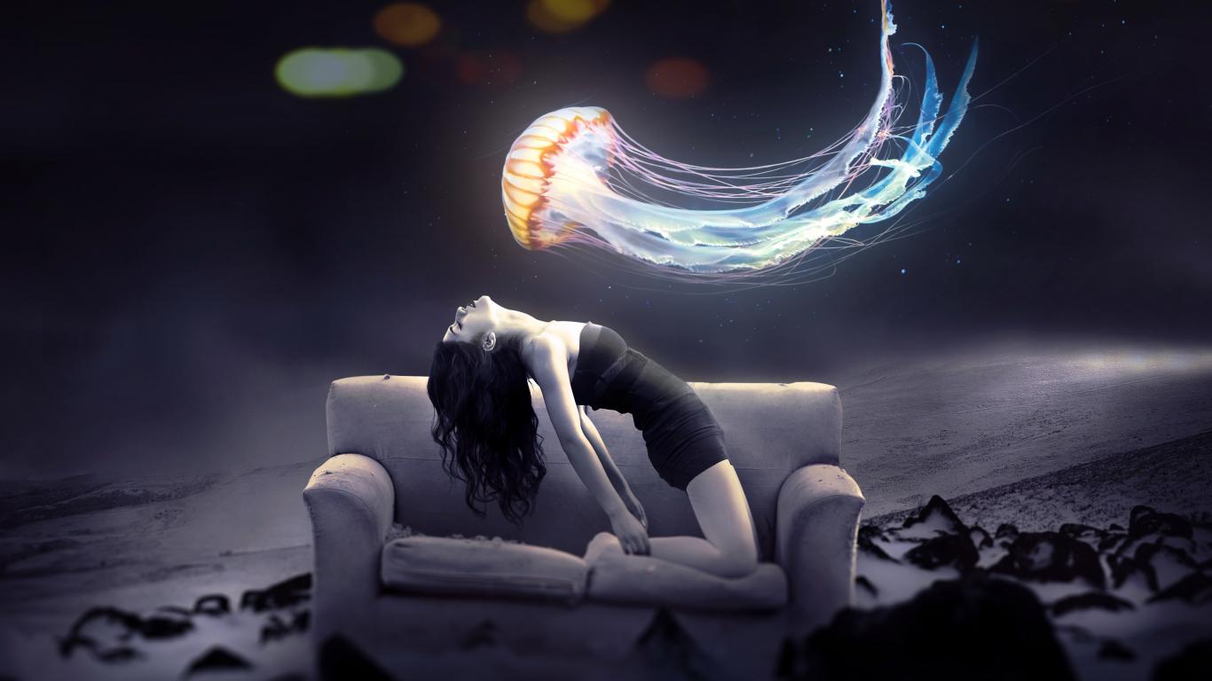 Wallpaper Medusa flies over a girl on a sofa, fantasy