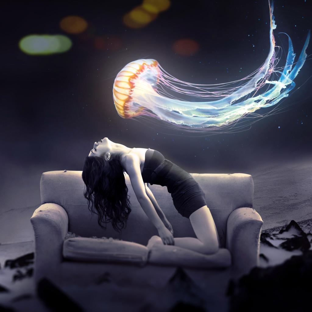 Wallpaper Medusa flies over a girl on a sofa, fantasy