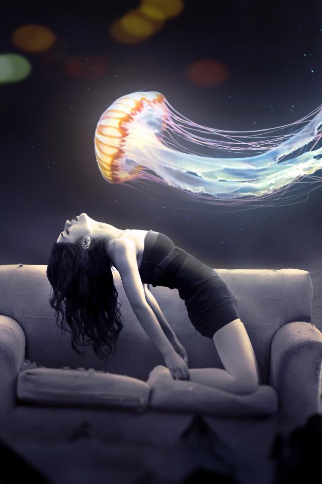 Wallpaper Medusa flies over a girl on a sofa, fantasy